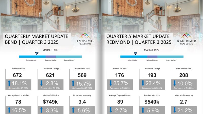 Click Here to see the Q3 Market Trends for Bend Real Estate and Redmond Real Estate, as well as the Q3 real estate trends in Sunriver, La Pine, Sisters, Prineville, Madras, Powell Butte, and Black Butte Ranch. In Q3 2025, the Bend Oregon Real Estate market and surrounding communities experienced a change when mortgage interest rates dropped in late summer. This enabled many Buyers who had been on the fence to finally make offers when their financed purchase became more affordable. Sellers who hadn't sold during the peak summer selling season were more inclined to consider below asking offers and to negotiate repairs. The number of active listings grew in all markets but Redmond, days on market increased in all markets but Redmond, and prices were up or down depending on the city. There was more balance in the market in most cities with the exception of La Pine, Madras and Powell Butte which reflect strong buyer's market. It is suggested that sellers in these cities list their homes at a price which is extremely competitive if their goal is to sell in a timely basis. A Bend Premier real estate broker understands the local Central Oregon real estate market trends, which is crucial to properly representing buyers and sellers. We can provide insights into which areas are popular, price trends, and the average time properties stay on the market. We can also provide you with access to listings that match your criteria, some of which may not be widely advertised. We also have the first word on properties about to hit the market, giving you an edge in a competitive market. 541-323-2779