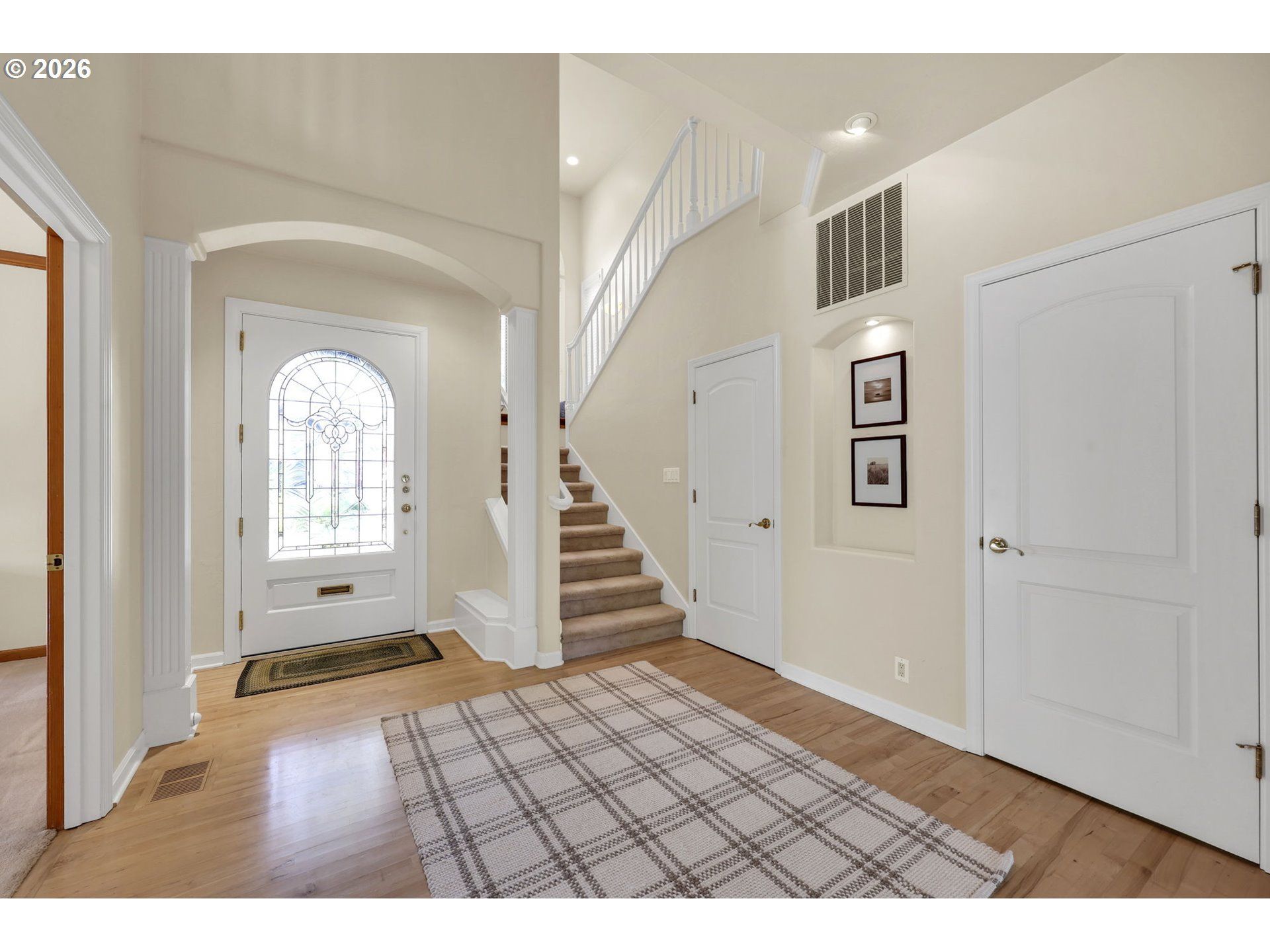Located in the Riverwalk neighborhood of Valley River Village, this custom built two story home offers a refined layout with quality craftsmanship in a beautiful setting just steps from the Willamette River. The kitchen serves as a central gathering space with thoughtfully designed custom lighting and cabinetry, black leathered granite countertops and large island. Conveniently located sky-lit dining area offers its own dedicated bar and expansive views of architecturally designed private landscape. The living room centers around a floor-to-ceiling gas fireplace and French doors that open to the arbor covered terraced patio. The two story foyer with hardwood maple floors and arched doorways adds to the sense of space and fine detail. A dedicated office off foyer offers custom lighting a quiet workspace with views and access to covered side patio and peaceful landscape. A temperature controlled mudroom with exterior access and built in sink offers flexible use as a garden and craft area. Upstairs the primary suite offers retreat with a walk in closet, flexible nook, and balcony access. The ensuite bathroom includes travertine floors, custom cabinetry, granite counters, and soaking tub. One of the additional bedrooms features a walk in closet and balcony access, while another works well as a bonus or second living space. Outside, the fully fenced backyard offers privacy in a peaceful setting, with covered patios and yard space designed for both everyday use and gathering. A natural water feature creates tranquility. The arbor covered patio includes dimmable lighting and gas hookups. Additional highlights include a central vac, security system, new windows, doors, exterior paint, and a spacious two car garage. Set within one of Eugene's more established neighborhoods, this custom home pairs thoughtful design with a location that offers easy access to the river paths, nearby parks, and everything the Riverwalk area has to offer.